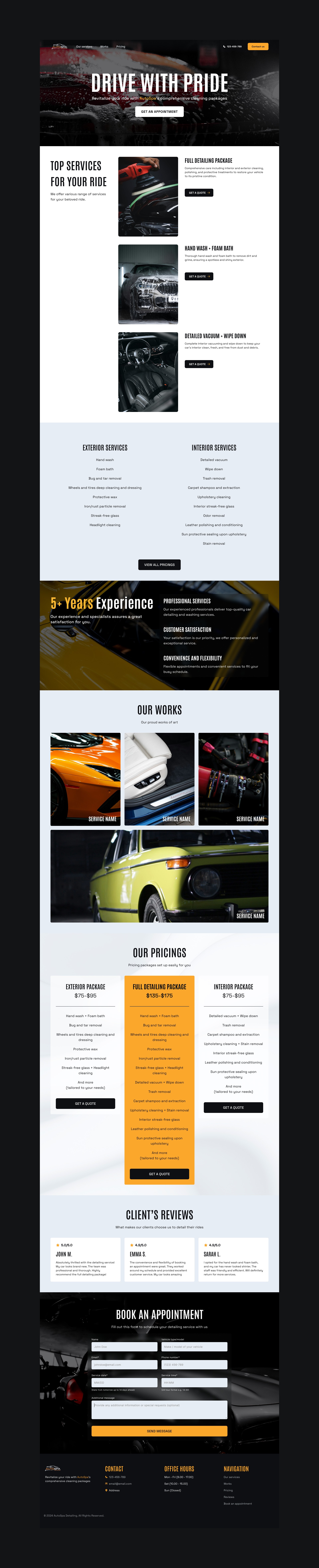 AutoSpa Detailing offers a crisp website ideal for showcasing premium vehicle detailing services. The homepage features immersive visuals and value-driven copy, quickly orienting users to available services. A streamlined booking flow guides users through service selection, vehicle details, and date/time scheduling. Service pages include FAQs, detailed descriptions of ceramic coatings, sealants, interior rejuvenation, and upgrade options. Testimonials and photo galleries reinforce trust and highlight quality results. With its polished branding and functional UI, AutoSpa Detailing is a portfolio highlight for service‑oriented site design.