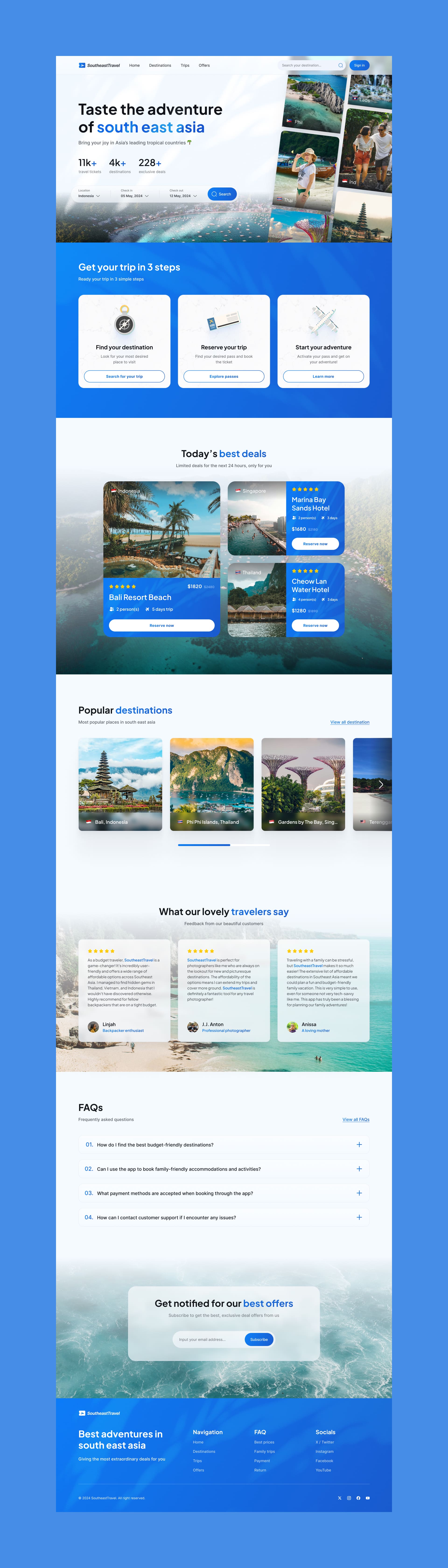 Southeast Travel was a conceptual design project where I had the freedom to prioritize aesthetic storytelling. Built for a design studio’s Dribbble showcase, the goal was to evoke wanderlust and clarity. I focused on large imagery, warm color palettes, and soft layering to guide users through imagined trips across Southeast Asia. With no backend limitations, I pushed the layout for visual rhythm and elegant flow.